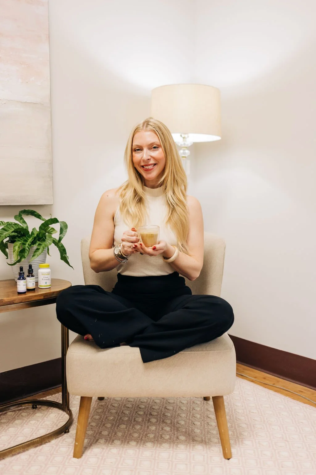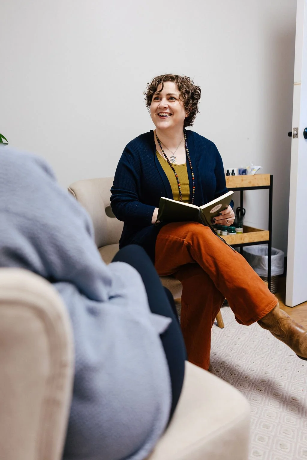 A woman sitting cross-legged on an armchair, holding a laptop and talking to another woman sitting nearby, in a room with shelves of small bottles and packages.